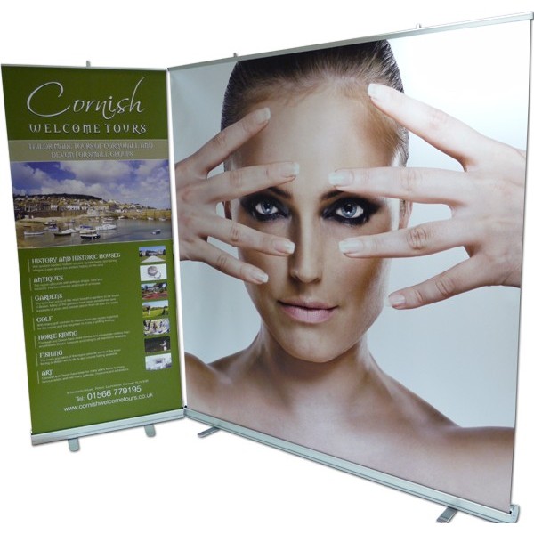 The giant roller banner stand uses twin support poles to give the huge graphic support over the whole width. The durable base mechanism uses a durable metal roller mechanism and features attractive, chrome finish fold-out feet for extra stability.