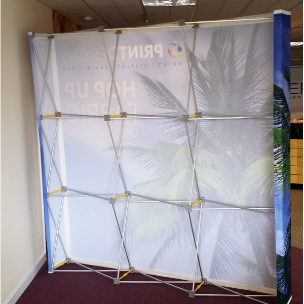 Traditional pop up stands use several heavyweight polyester panels that hang magnetically on the folding framework. The hop up stand is different and uses a single piece of printed fabric which is held in place on the frame using velcro. There are no panels to line up and being made from fabric, the graphic is lightweight and durable.
