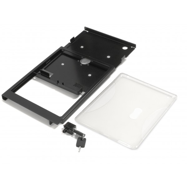 Once fixed to the worktop (using the supplied screws) the housing of the iPad holder can be locked to protect the device from theft (2 keys are supplied).