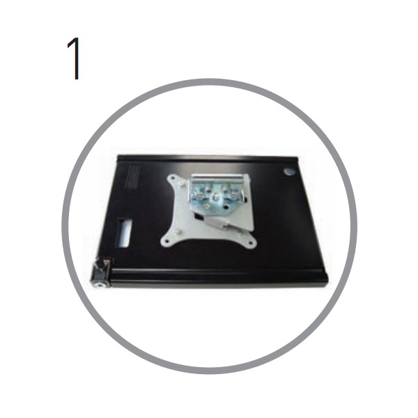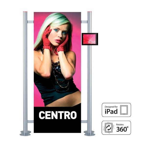 The iPad is slid into the enclosure which has a VESA mount bracket on the reverse. The VESA mount has an adjustable clamp which is designed to dock into the slot on the face of most exhibition shell scheme posts.