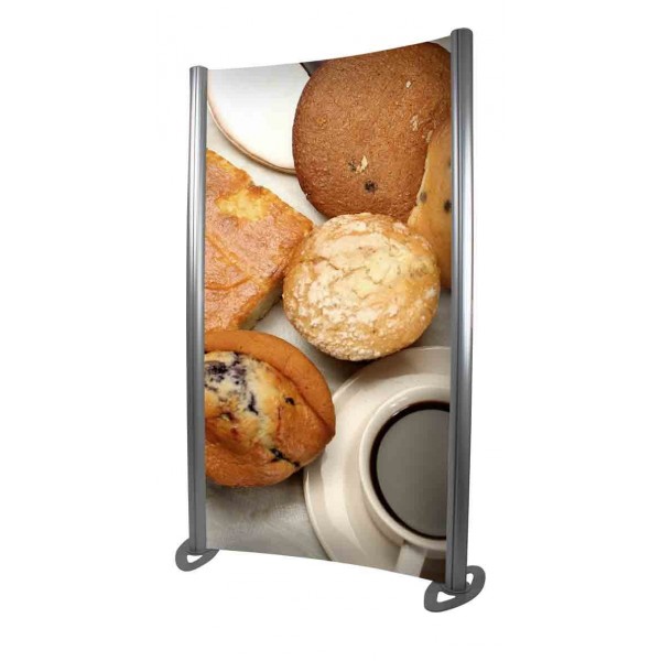 Graphic panels for the linear curved graphic kit are produced as standard using a heavyweight Opal Polyester flm with a scratch resistant overlaminate finish. Depending on the size of the dispay 1,2, or 3 sections are used that attach to the framework magnetically to complete the display.