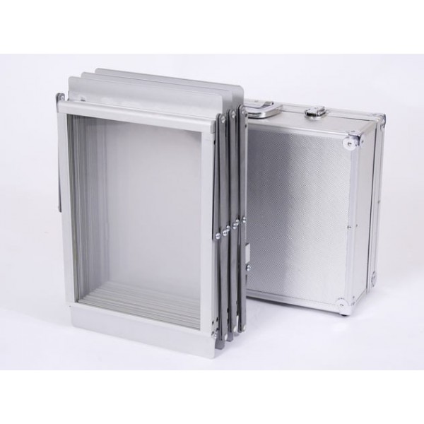 The Z Up Lite brochure holder folds-down into a very compact aluminum flight case to protect it from damage in transit.