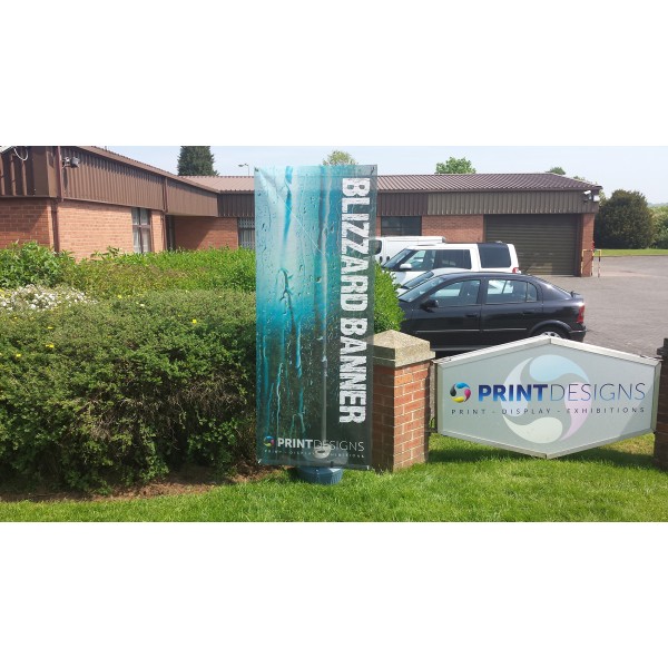 When printed onto PVC banner material, the Blizzard stand is suitable for use in wind-speeds of up to 10MPH. When printed onto Mesh material, the Blizzard stand is suitable in wind speeds up to 18MPH. These wind-speeds assume that Blizzard base is weighted using sand.