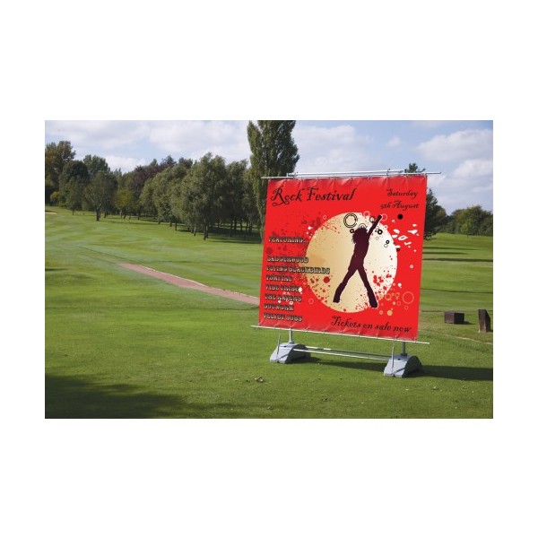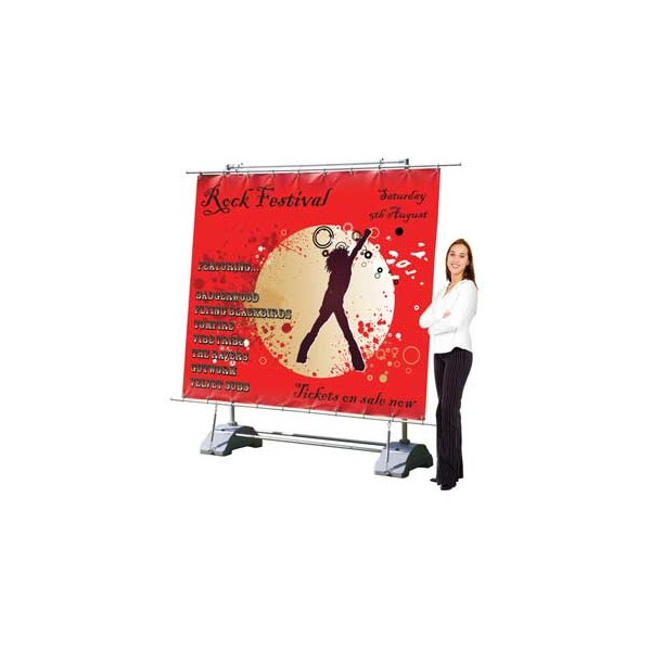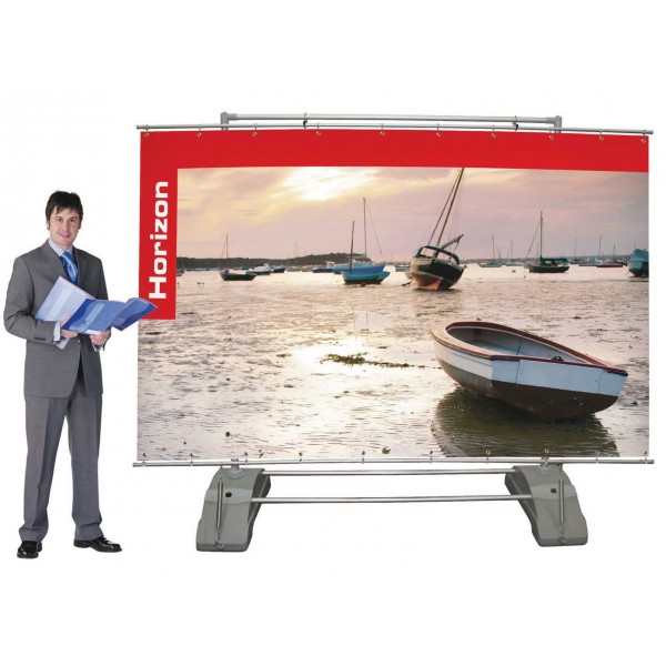 Horizon banner stands utlise a simple aluminium framework and weightable plastic bases to create a framework that is tough, easy to assemble and stable enough to be used outdoors in light to moderate wind conditions.