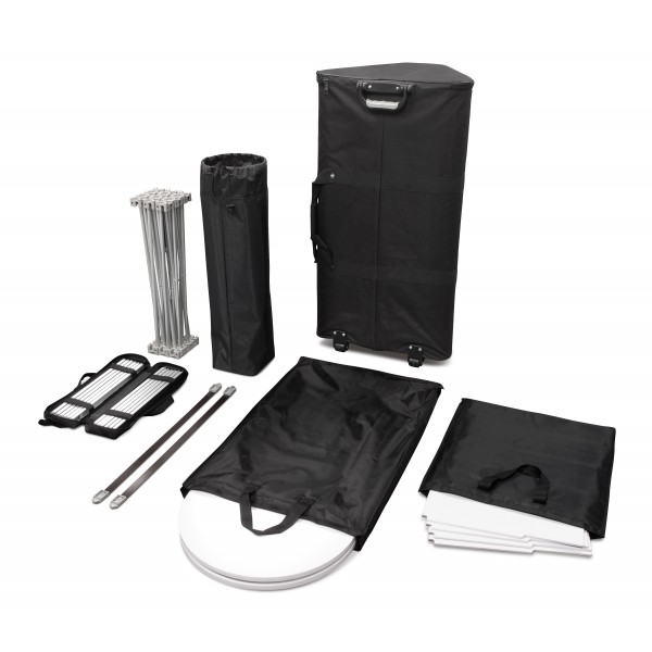 The Eurostand pop up counter is supplied complete with a carry bag and a full colour printed graphic panel, printed onto heavyweight stoplight polyester and laminated with a scratch resistant finish film. The graphic panel wraps-around the structure to create a smooth, curved shape.