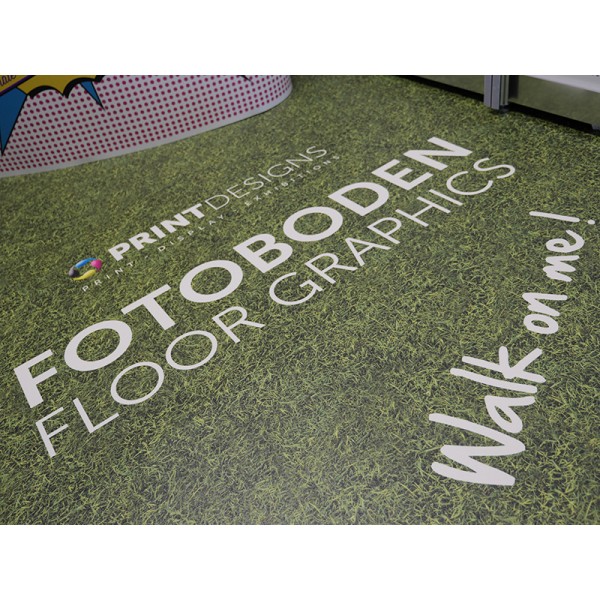 Fotoboden is a 2mm thick, printable vinyl that is perfect for use either indoors or for short term application outdoors. Shopping malls, airports, offices and exhibition stands can all make use of printable flooring to enable a more efficient use of traditional floor space as an effecive advertising medium.