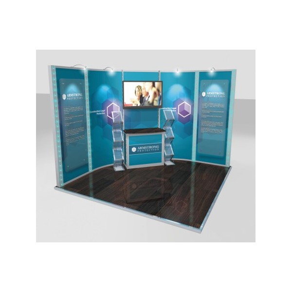 The LBS-04 is a popular system designed for the most widely used 3M x 3M exhibition booth. The design features a panelled wall with integrated lighting, a large counter/desk and two portable literature holders that can be positioned within the stand area.
