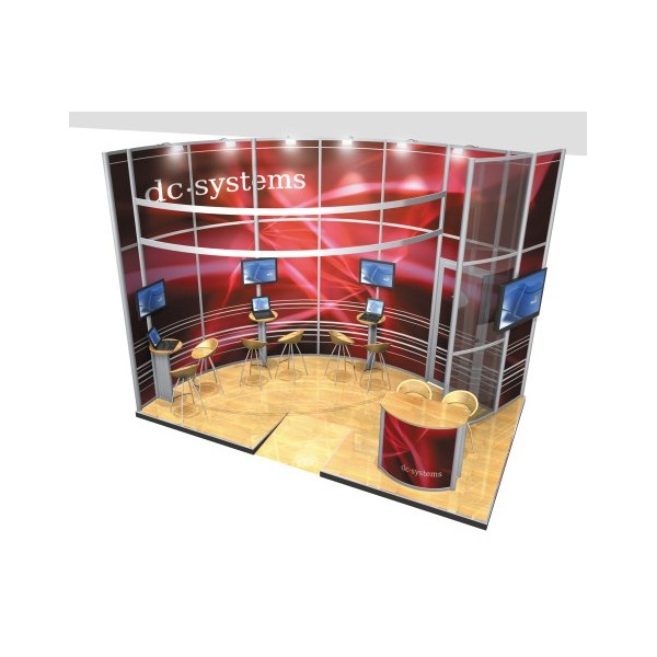 We offer this system either as a self assembly kit or with an option to include delivery and installation. Optional installation is based upon any event hall in the London or Midlands area. The installation price also allows for the rental of a decked floor underneath which cabling on the stand can be hidden neatly. Printdesigns can usually offer a delivery and install package to almost any desination, please call to discuss your requirements.