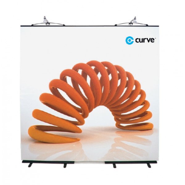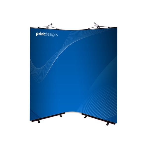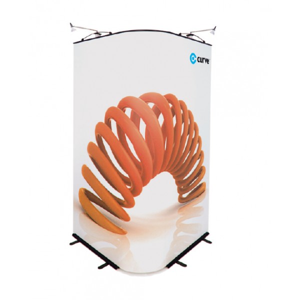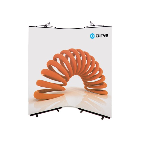 The Twist Curve Display System is supplied as a three panel kit. There are two straight shaped wings linked together with one central, flexible hinge panel. The curvature of the central straight panel can be varied so that the finished shape of the stand can range from being concave, straight of convex thus making it hightly adaptable.